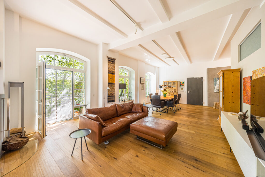 VERKAUFT 2025: Ganz nah am Wasser gebaut! Wunderschöne und sehr coole LOFT-WOHNUNG direkt am Fluss „Kleine Luppe“ hinter der RB Leipzig Geschäftsstelle! Bezugsfrei mit hochwertiger Ausstattung und vielen Extras überzeugt dieses Unikat vor allem mit der idyllischen und sehr ruhigen Lage. Sitzen Sie über dem plätschernden Wasserlauf auf Ihrem gemütlichen Balkon und schauen von hier aus ins Grüne bei beruhigendem Vogelgezwitscher. Das Loft befindet sich im 1. Obergeschoss eines kernsanierten Fabrikgebäudes und bietet auf ca. 180 qm Wohnfläche einen sehr großen Wohnraum mit Kamin, Essbereich und offener Küche (inkl. moderner Einbauküche), zwei Schlafzimmer, ein Arbeitszimmer, zwei Abstellräume und zwei tolle Badezimmer – die Beheizung erfolgt komplett über eine Fußbodenheizung. Zusätzlich gehört zu der Wohnung ein Stellplatz und ein Kellerraum. Das Loft hat die typischen Merkmale wie xxl-Industriefenster (eingefasst in weisse Holzrahmen), sehr hohe Decken und teilweise Sichtbetonwände. Eine richtig coole und individuelle Wohnung direkt gegenüber des Trainingszentrums von RB Leipzig.